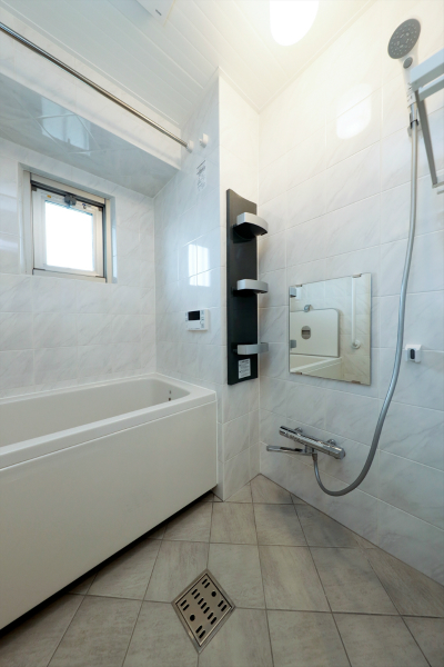▲浴室もグレートーンで統一しました。斜め張りにした床と梁下のタイルがおしゃれです。