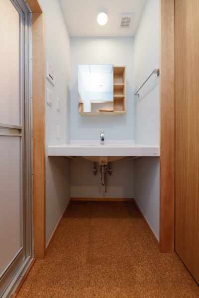 ▲壁の幅に合わせてオーダーしたマーブライトカウンターですっきりとした洗面台。
