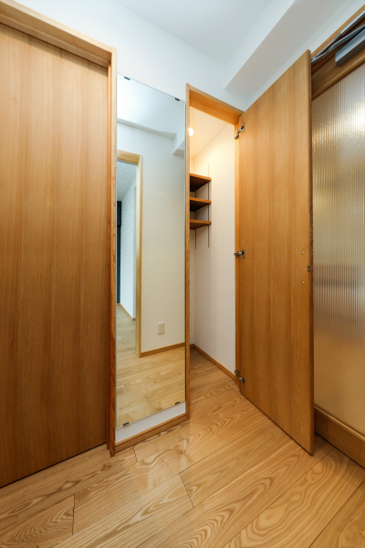 ▲廊下に取り付けた大きな姿見と収納。