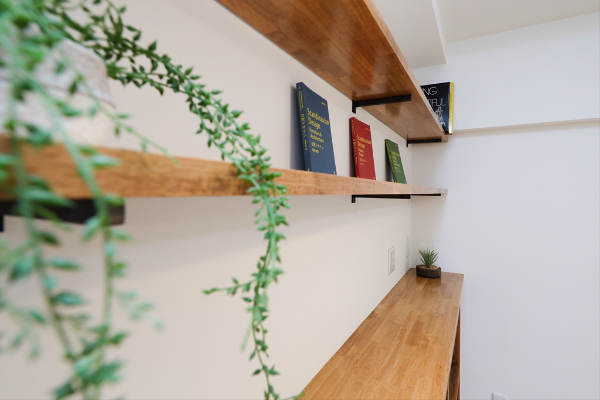 ▲キッチン側の壁にカウンター型の収納棚を造作しました。