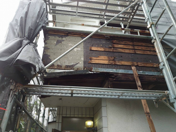 ベランダは水漏れしていた箇所を中心に下地や構造材の腐食がかなり進んでおり、金属製の手すりとモルタルだけでもっていたような状態でした。