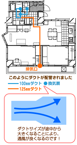 ダクトは、左の図のように途中からサイズを広く、例えば125mmや150mmにしておくと、通風が良くなります。