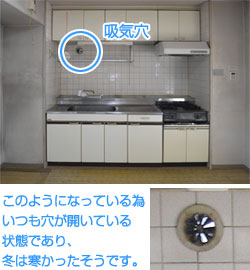 しかし、こちらのマンションの場合、昔のキッチンの仕様に合わせ、吸気穴と排気穴は離れて付いています。