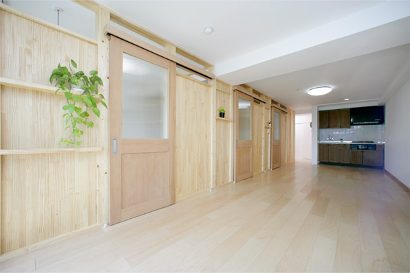 個室の間仕切りは、ゆるやかに区切り、将来的には撤去しやすい 天然木パネルと木の柱で造ったパーテーションにしました。 |