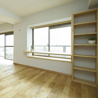 和室だった頃の名残を残すこの出窓の奥行きと高さをうまく利用し、オリジナルの足元収納付きデスクを製作しました。