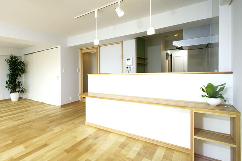キッチンはもともとあった場所から少しダイニング側へ出して、LDKが一体となったオープンな空間になりました。