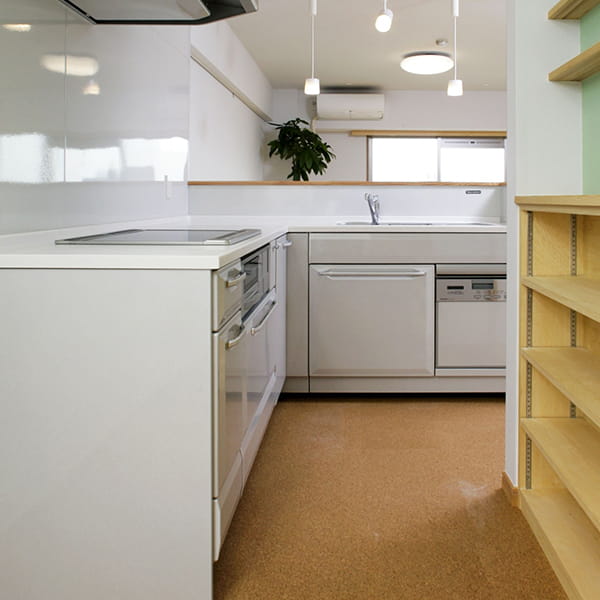 立ち仕事が多いキッチンの床は柔らかく足腰に負担のかからないコルクタイルです。