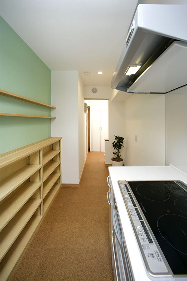 このスペースには造り付けの収納棚を設置した他、お手持ちの収納家具で食品や日用品のストックなどをしまうバックヤードとして使用されます。