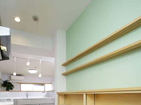 造り付けの収納棚上部の壁は、爽やかなグリーンの壁紙を張り、空間のアクセントにしました。