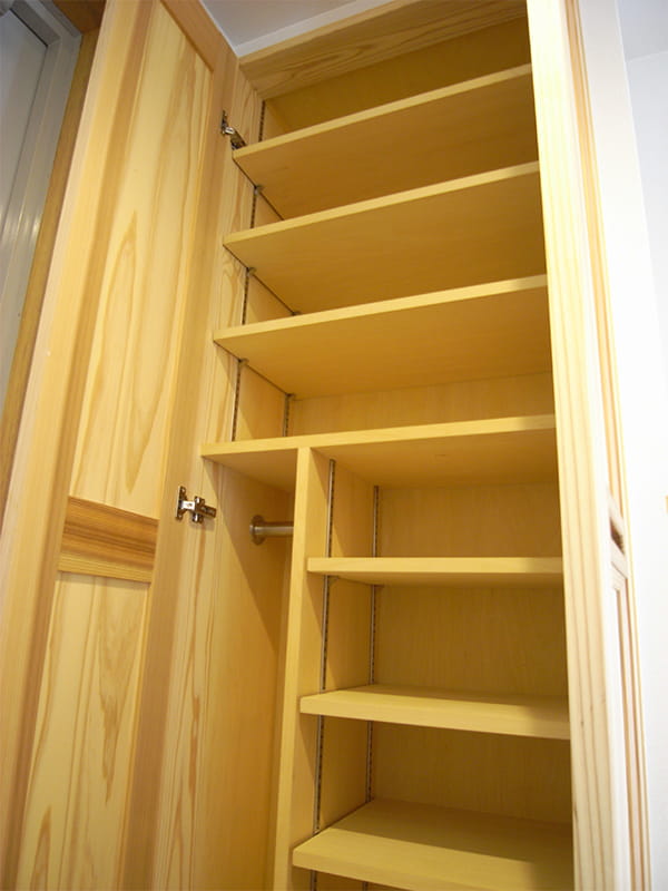 お客様から見えない部分は扉なしのオープン収納に、逆にお客様がいらした時にさっと隠したいところは引き戸を設けるなど、その場所にあった収納をご提案しています。
