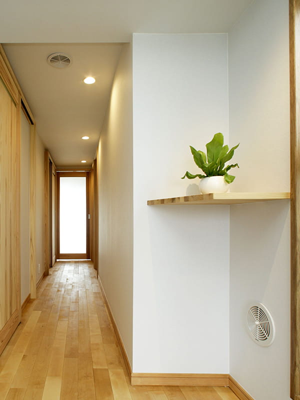 廊下の床に使用しているのは、リビングと同じ無垢のフローリング。