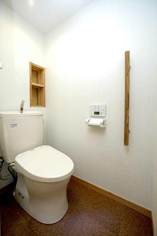 トイレには玄関と同じ木製の手すりを設置。浴室との間の壁厚を利用し、空間を圧迫しない便利な収納も取付けました。