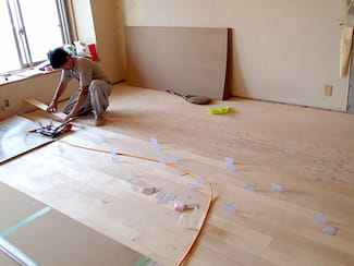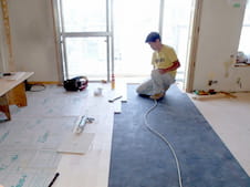 防音規定のあるマンションで無垢フローリングを使う場合は、あらかじめ防音シートを敷き、その上からフローリングを張っていきます。