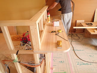 キッチンのカウンターを製作中。軽食を食べたり、ちょっとお茶を飲んだりするのにちょうどいいサイズです。