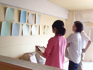 実際の場所に立って棚の高さを確認したり、壁紙の色を決めたりと、出来上がりの雰囲気をみながら確認していただきます。