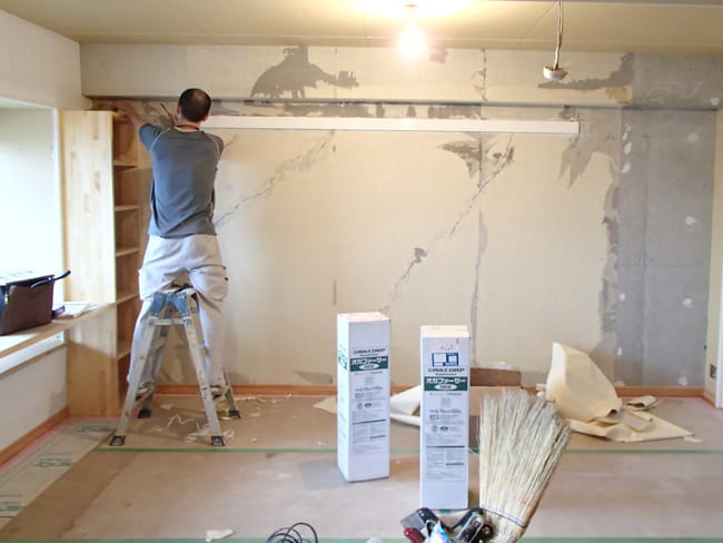 既存の壁紙を剥がし、自然素材の壁紙オガファーザーへ張り替えます。