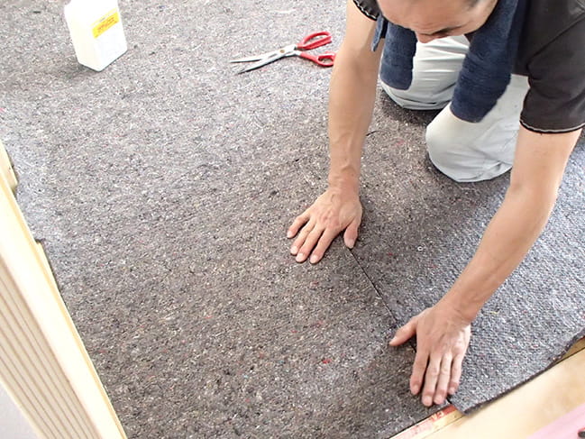 カーペットを隙間なくピッタリと敷くのにも、職人さんの技が光ります。