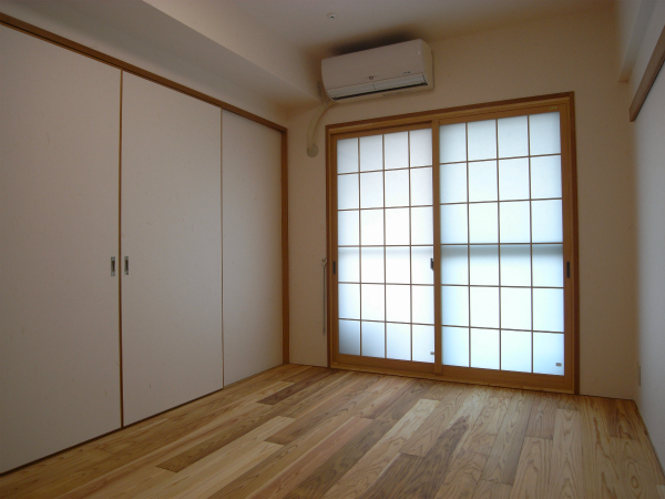 ▲和室の畳を無垢フローリング張りに変更し、障子は障子風のインナーサッシに取り換えました。和紙調のガラスで風合いそのままに断熱性や気密性がアップしています。