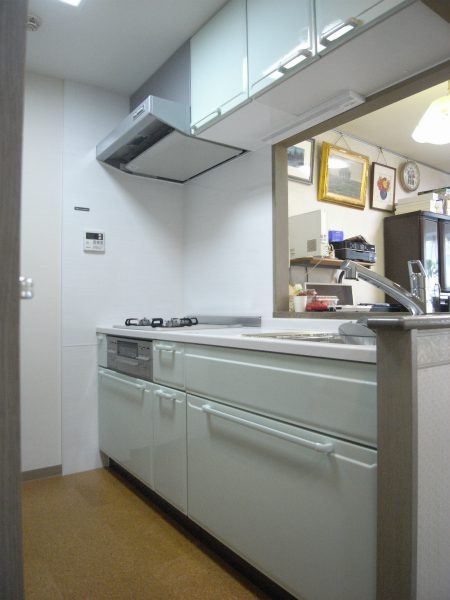 ▲淡い色合いが爽やかなタカラスタンダードのホーローキッチンにお取替えしました。床には水に強いコルクタイルを張っています。