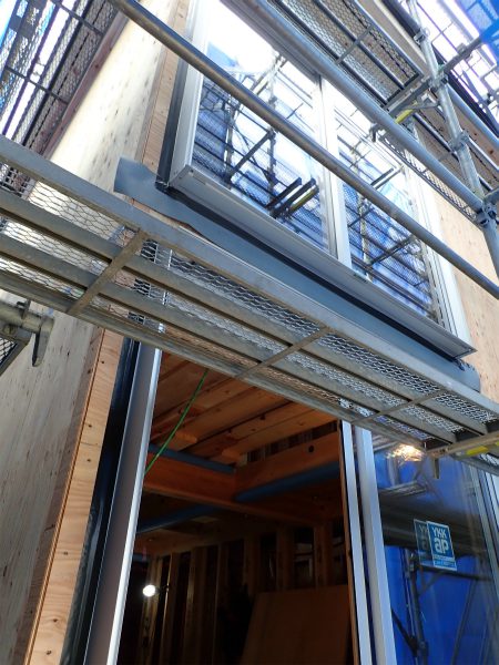 ▲外壁の下地となる構造用合板が張られ、窓を取り付けました。木になじむカラーの樹脂窓です。断熱性の高いLow-Eガラスを採用しました。