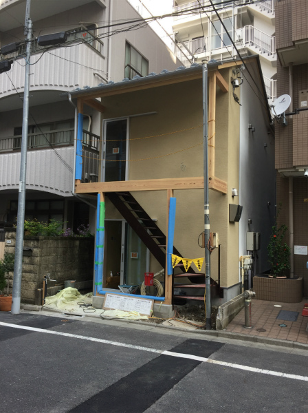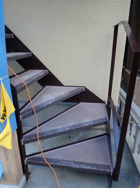 先日取り付けられた外階段は塗装されて落ち着いたブラウンになりました。
