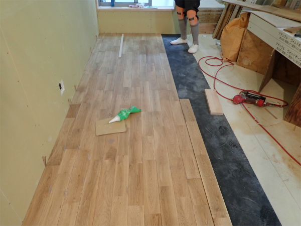 ▲床はナラの無垢フローリング。下に吸音材を敷いています。