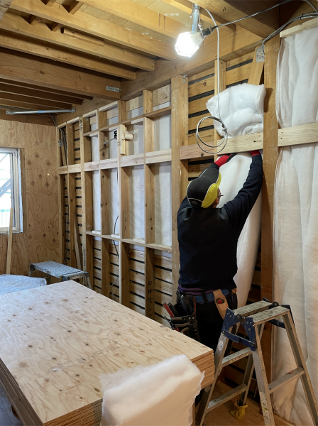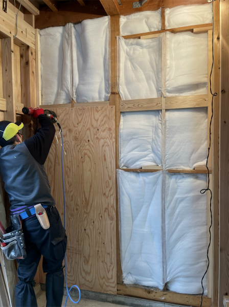 壁と天井には綿状の断熱材を隙間なく詰め込んで、しっかり断熱します。