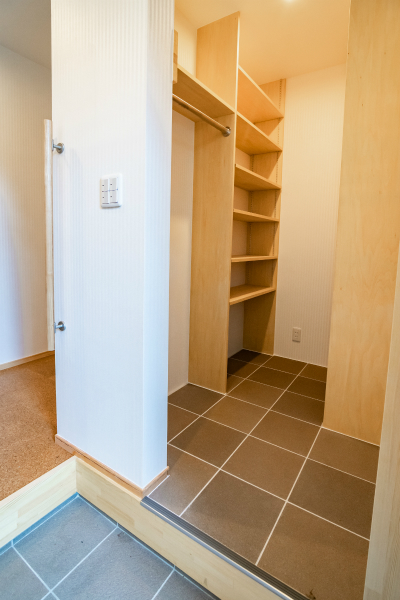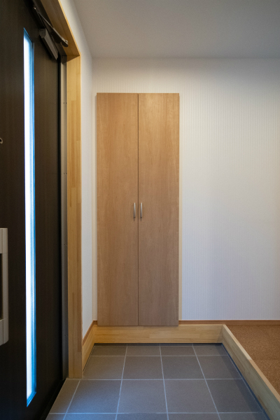 T様邸は親世帯・子世帯あわせて6人がお暮らしになるため、玄関と土間収納を広くとりました。