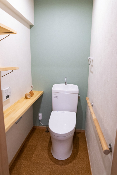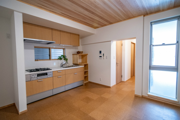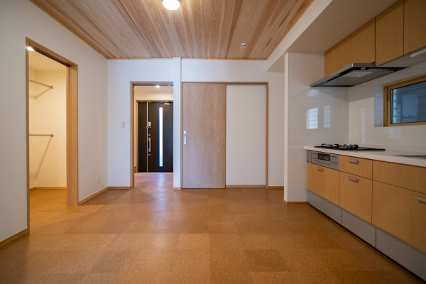 1階の床は柔らかく足腰への負担が軽いコルクタイル、天井には無垢の杉板を張り、落ち着いた雰囲気のお部屋になっています。