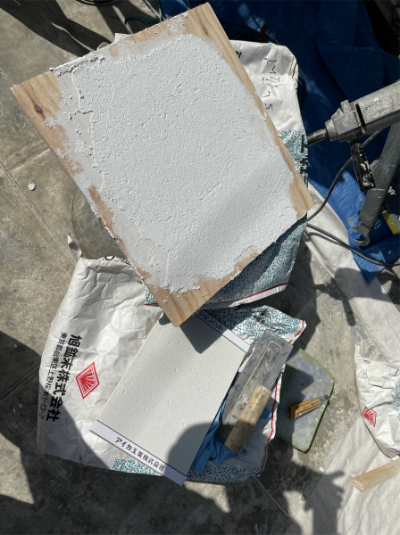 ▲タイルの上に、仕上げ塗材との仲介接着剤になるカオチンタイトを塗っていきます。