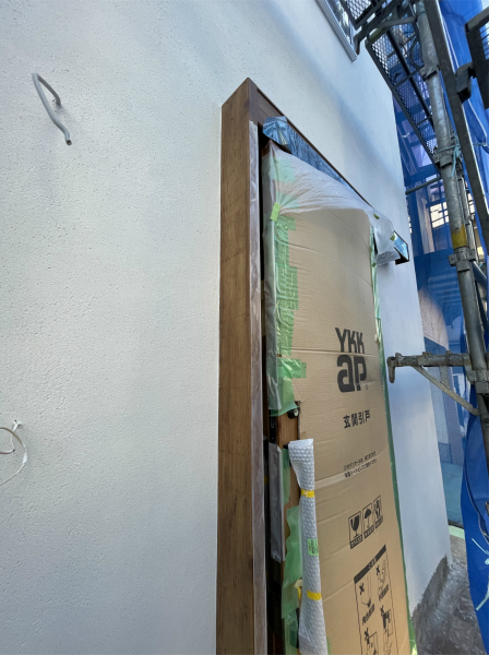 まだ足場で囲まれているので全体像は見られませんが、外壁の仕上げだけでなく、窓、玄関も新しくなっているので、以前とはまったく違う家のような印象になっているかと思います。