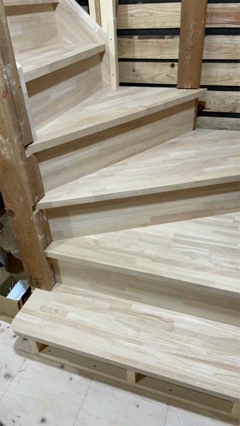 F様邸の階段には、ラバーウッドの集成材を使用します。ラバーウッドはパインや杉のような針葉樹よりも硬い木のため摩耗に強く、頻繁に昇り降りする階段にも適しています。