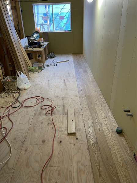 2階では、キッチン搬入前に床の無垢フローリングを施工しました。