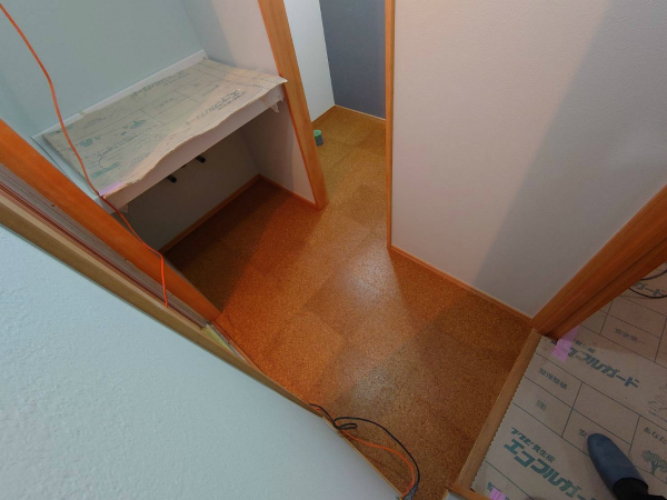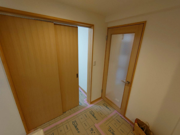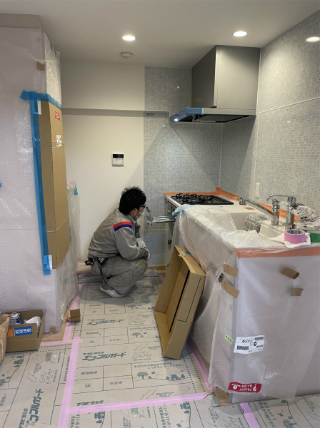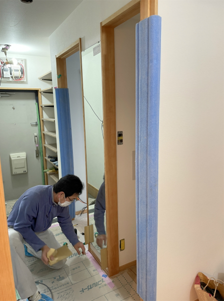 エコリフォームの西澤です。江東区のマンションリフォーム現場は、いよいよ完成間近。造作家具の取付や、壁紙・建具などを施工し、内装の仕上げを行いました。