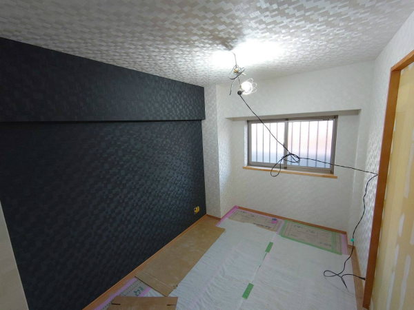 ▲ビス穴などをパテで埋め、平らになった下地の上にクロスを張ります。