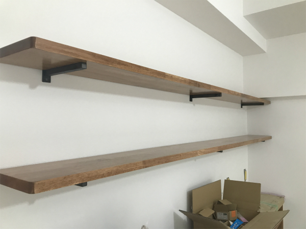 ▲リビングの棚板は濃い色のオイルで塗装しました。