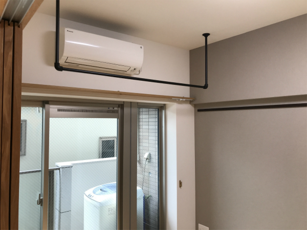 ▲リビングの天井に部屋干しができるハンガーパイプを取り付けました。エアコンの風でよく乾きそうです。