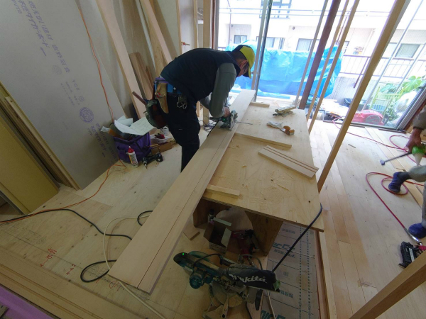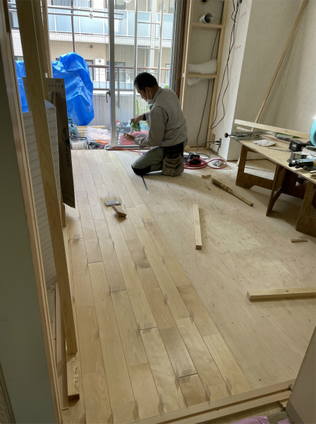 N様邸の床はカバ桜の無垢フローリングを張ります。無垢材は気候によって伸び縮みがあるため、スペーサーを挟んで隙間を調整しながら施工していきます。