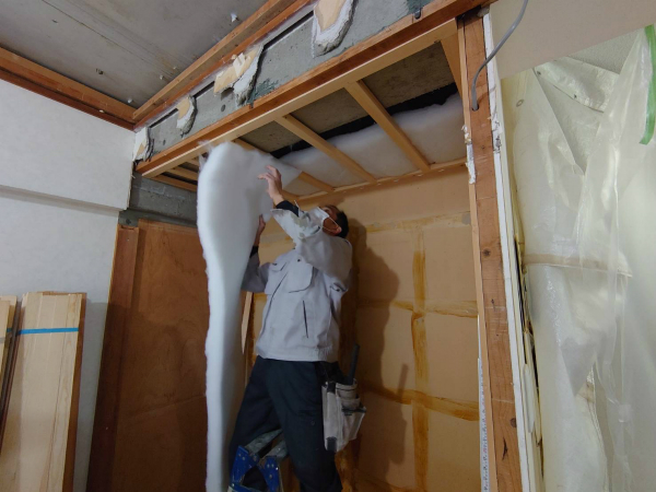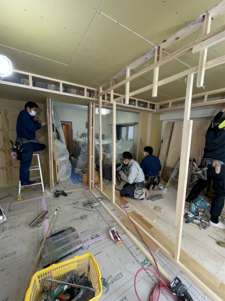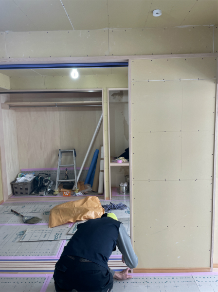 現在進行中の工事は、4LDKのマンションの和室2部屋を洋室へとリフォームしている中央区のN様邸。築40年のマンションで、畳の傷みが気になっていたとのこと。ベッドを置いて寝室にしているため、洋室へとリフォームしたいというご希望です。