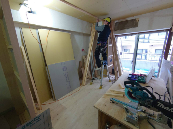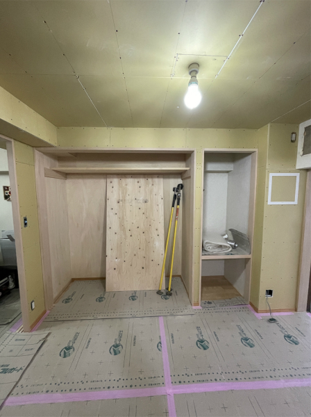 これで下地はほぼ出来上がりです。ここに建具などを取り付けて壁紙を張り、仕上げを行っていきます。仕上げの様子はまた次回ご紹介したいと思います。