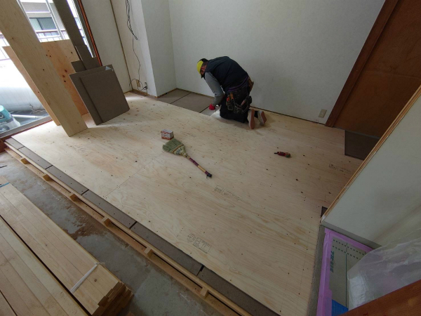 フローリングは、張り終えた場所から養生シートを敷いて、工事中に傷が付かないようにしておきます。