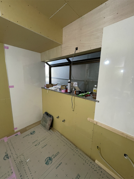 ▲キッチンセット取付完了。水栓やコンロは後日取り付けます。