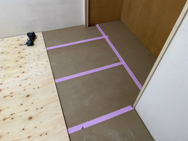 ▲既存の床の上に足を付けたボードを置き、間に断熱材を入れこみます。