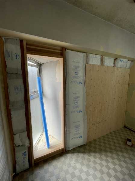 背の高い出窓のあるお部屋は、マンションの角になる場所。こちらは外部に面する壁に断熱材を入れました。