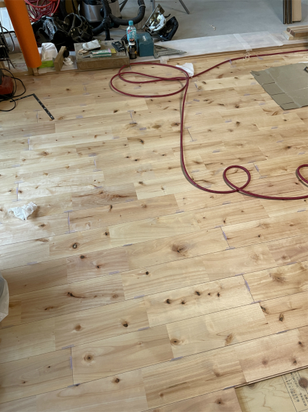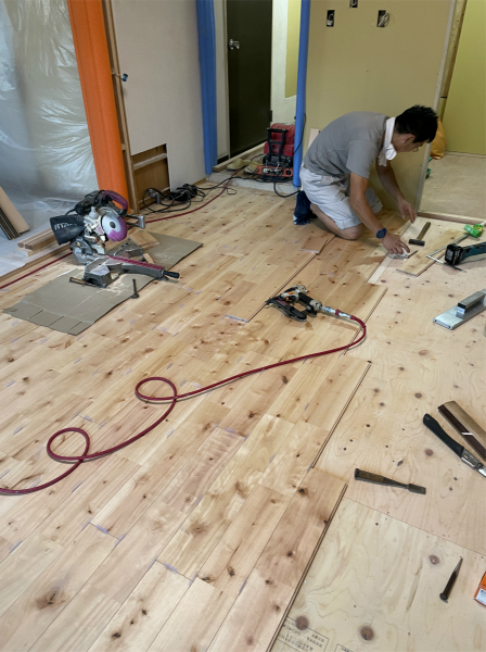 ▲リビングも既存の床の上から無垢フローリングを施工します。
