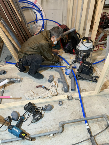 以前はワンフロアを分けて2世帯で使っていたため、水まわりの設備も2世帯分あり、床下は複雑な配管になっていました。今回は設備の数が減るため、必要な配管を整理して新しくしました。