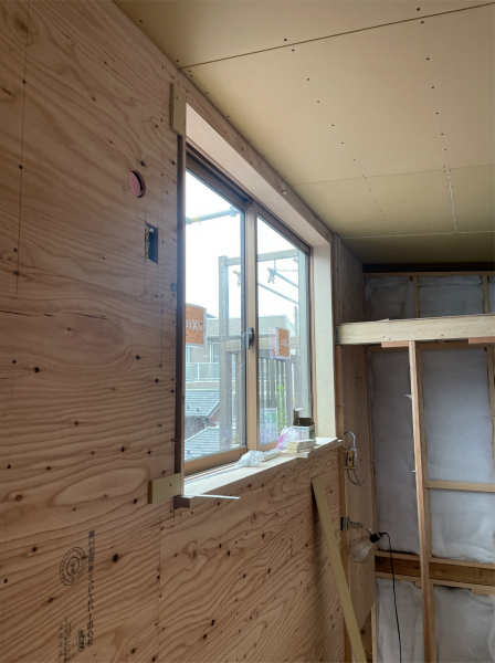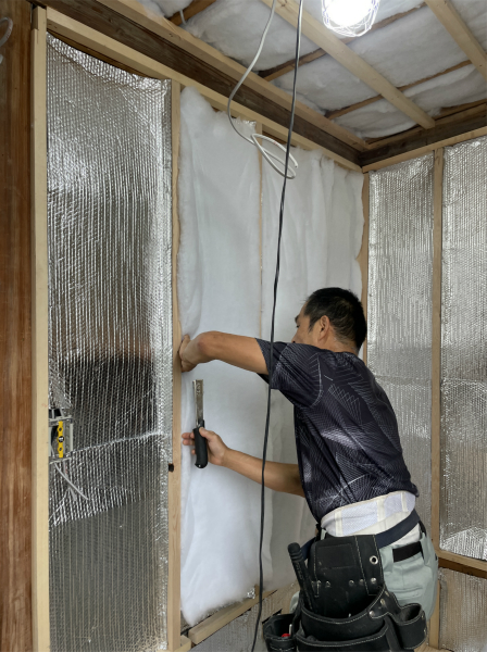 屋根と同じように日があたるロフトの壁も、遮熱シートと断熱材で暑さ対策をしています。