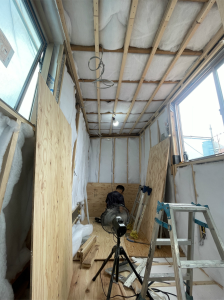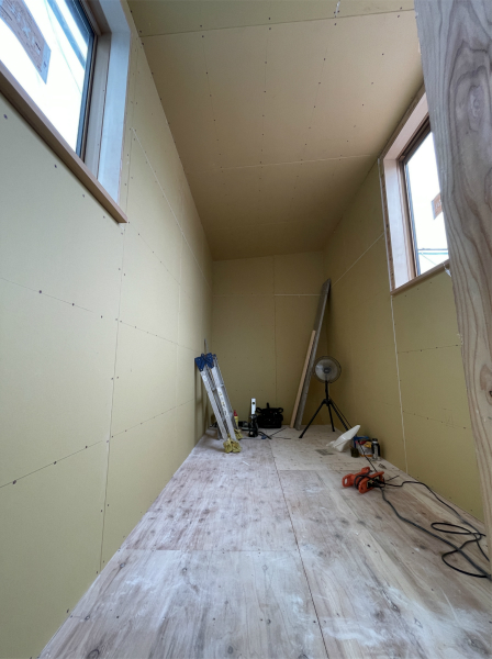 雨が降る前の屋根下地は一段落できたので、この後は内部の工事を進めていきます。