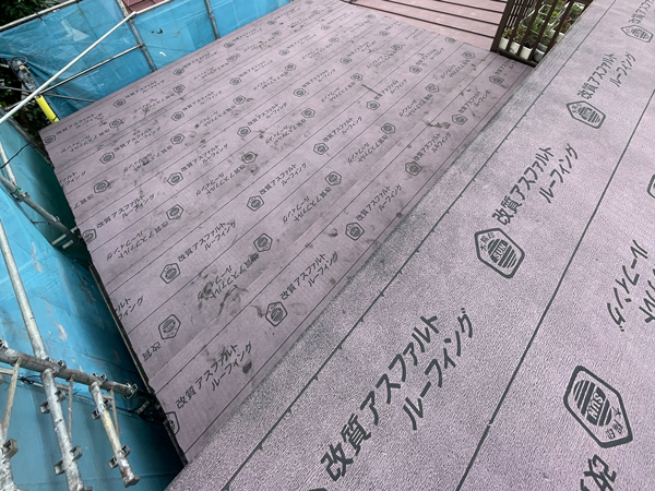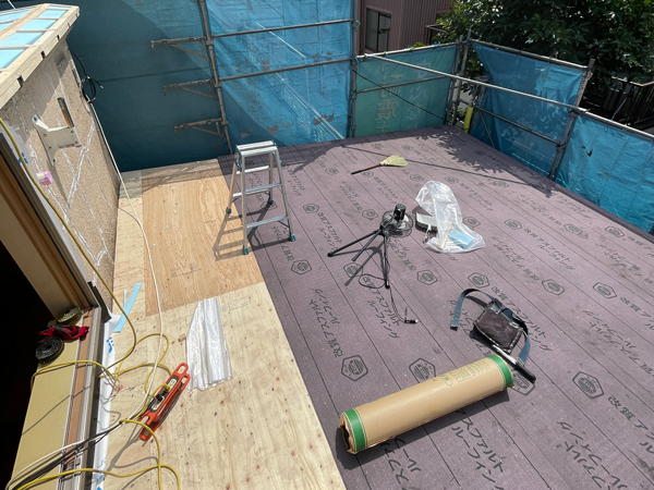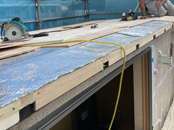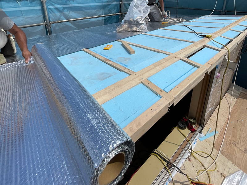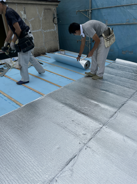 屋根は太陽の熱を最も受ける場所のため、下地には断熱材に加えて遮熱材を施工しました。