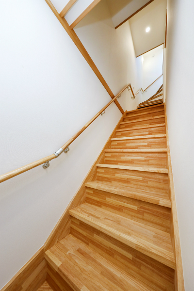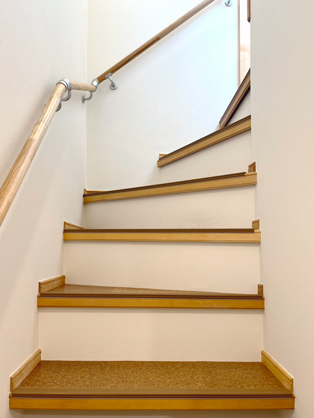 1階から2階へ上がる階段は、ラバーウッドの集成材で新しく架け替えました。